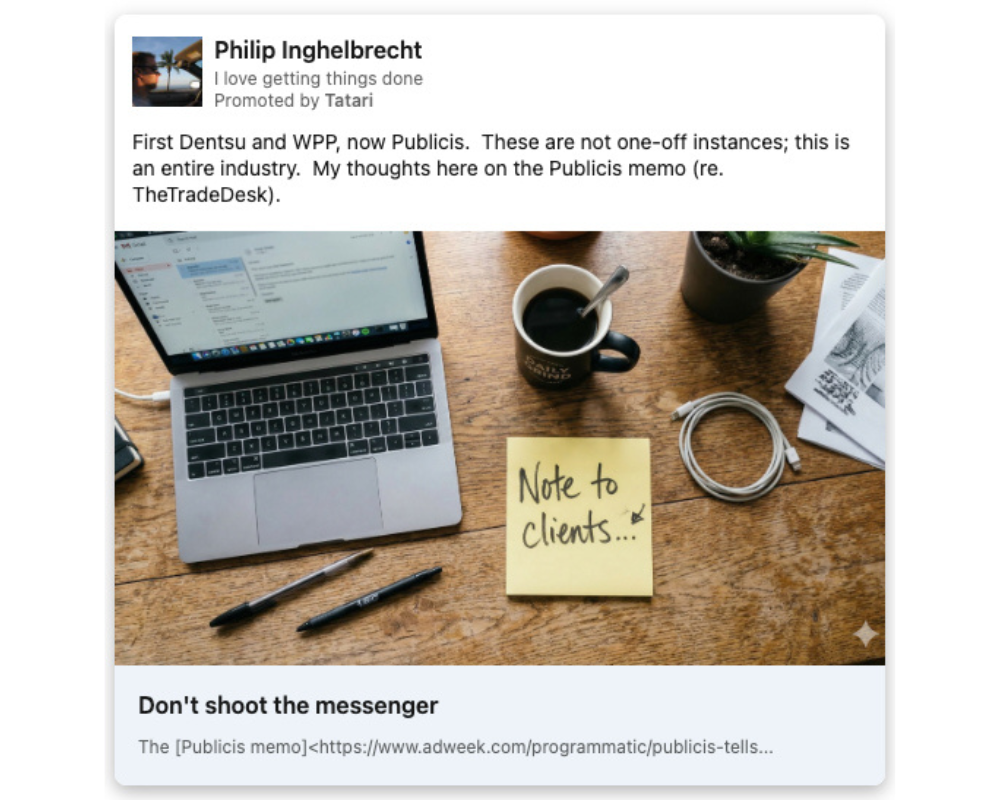 Tatari e Illumin han optado por una fórmula parecida, apoyándose en contenido de sus propios ejecutivos para capitalizar la conversación. Tatari promocionó en LinkedIn un post de su cofundador y CEO, Philip Inghelbrecht, en el que vinculaba el caso Publicis con decisiones previas de Dentsu y WPP y defendía que el problema no afecta solo a una compañía concreta, sino al propio modelo de programática abierta aplicado a la televisión. En sus declaraciones a ADWEEK, Inghelbrecht insistió en que la cuestión de fondo no es solo qué plataforma merece más confianza, sino si la infraestructura tradicional de DSP encaja realmente con la compra de TV. Conviene recordar, en todo caso, que Tatari no opera como DSP, sino como plataforma de compra directa de TV con publishers.