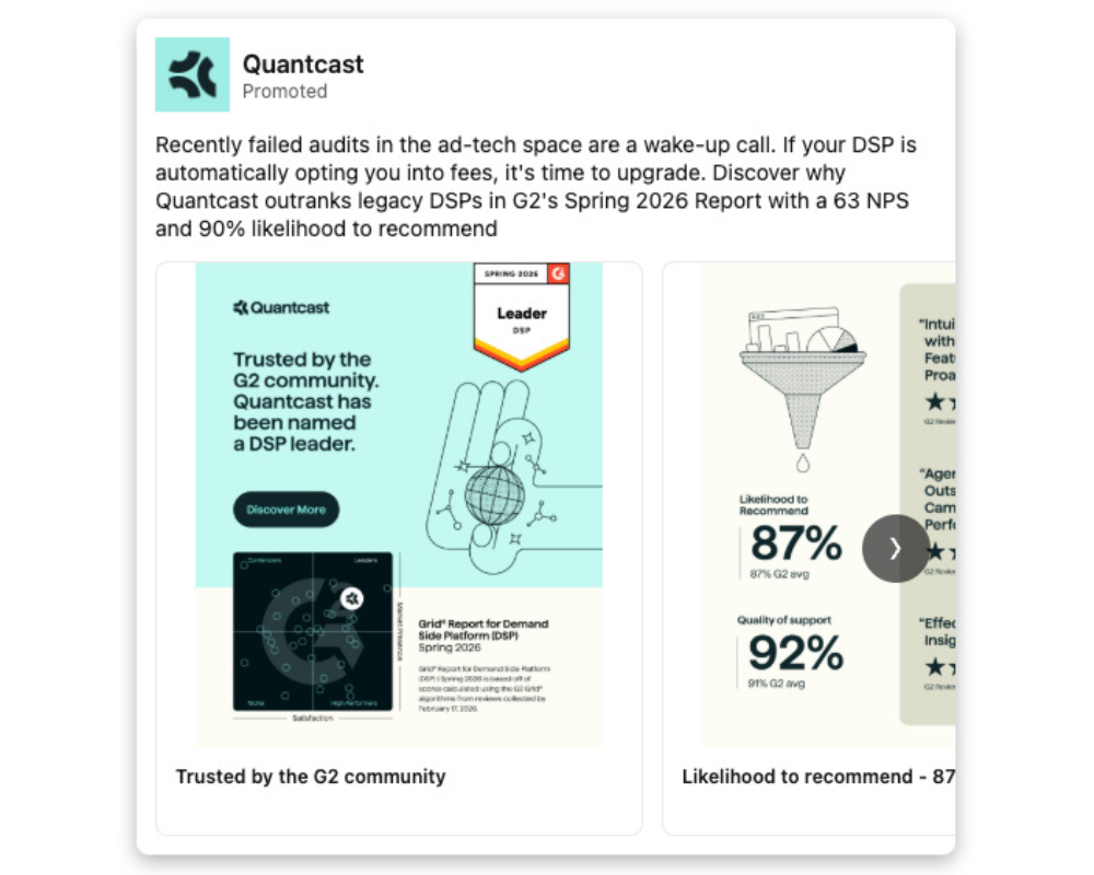 Quantcast ha sido uno de los casos más evidentes. En una creatividad promocionada en LinkedIn, visible también en las capturas que acompañan este artículo, la compañía apelaba a las “auditorías fallidas recientes” en adtech y advertía contra los DSPs que activan fees de forma automática. Aunque la firma no respondió de forma directa sobre esa campaña, su Chief Marketer, Rebecca Rosborough, trasladó a ADWEEK que la prioridad de Quantcast sigue siendo ofrecer soluciones que den confianza a los marketers sobre su inversión en medios.